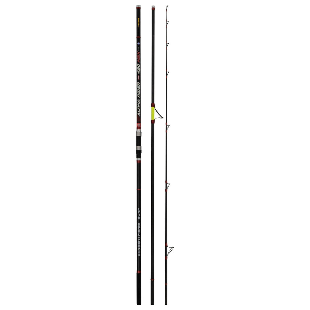Cana de três secções, em carbono, com ponteira híbrida em carbono maciço e com o cabo com reforço hooven carbon.