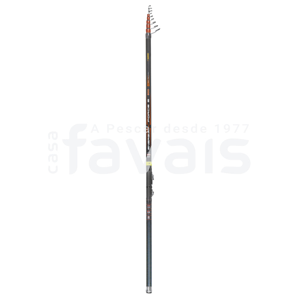 Cana telescópica em carbono reforçado com X-Carbon Yarn, muito robusta, e com ação de ponta. Com um teste de curva de 8Kg, esta cana foi especialmente concebida para pesca com boia de pião, em pesqueiros onde há necessidade de içar peixes grandes. A ENERGIA FORCE 2, vem equipada com porta carretos CAIXIN, montado em posição invertida, e passadores KL e KT, para pescar com linhas entrançadas.
