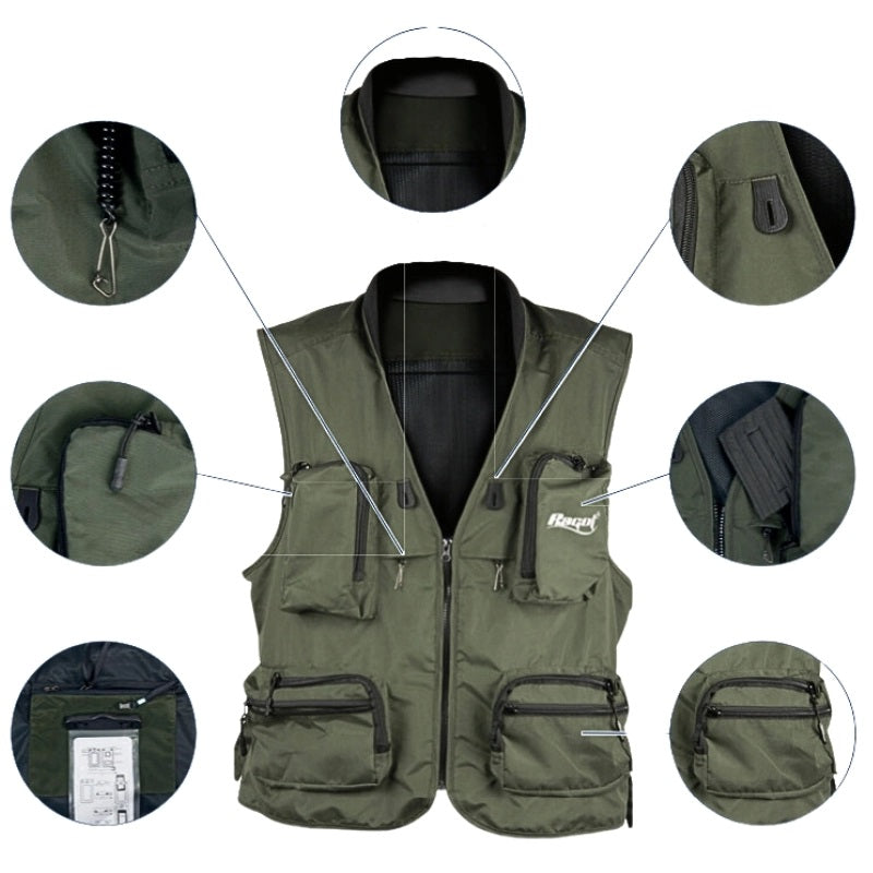 6 bolsos na frente para guardar as caixas e o pequeno equipamento de pesca.